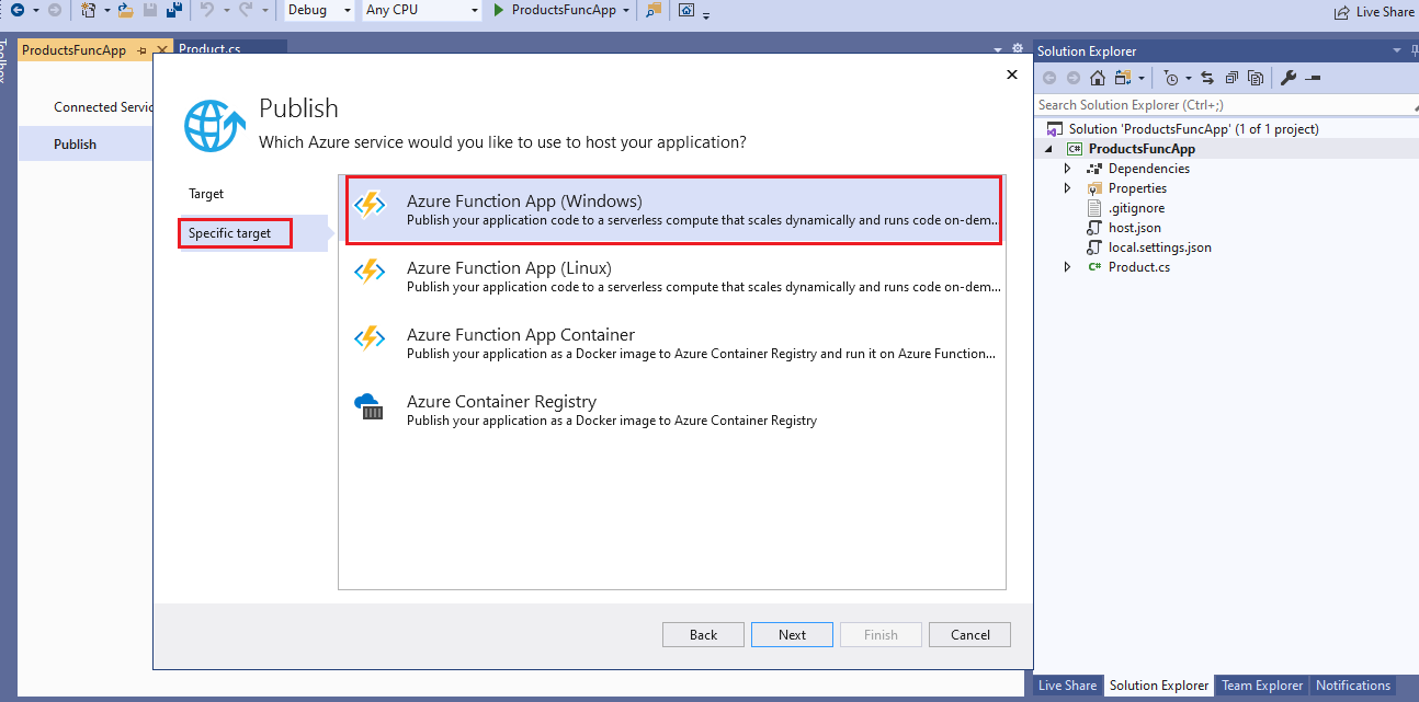 new item “Product” as Azure Function